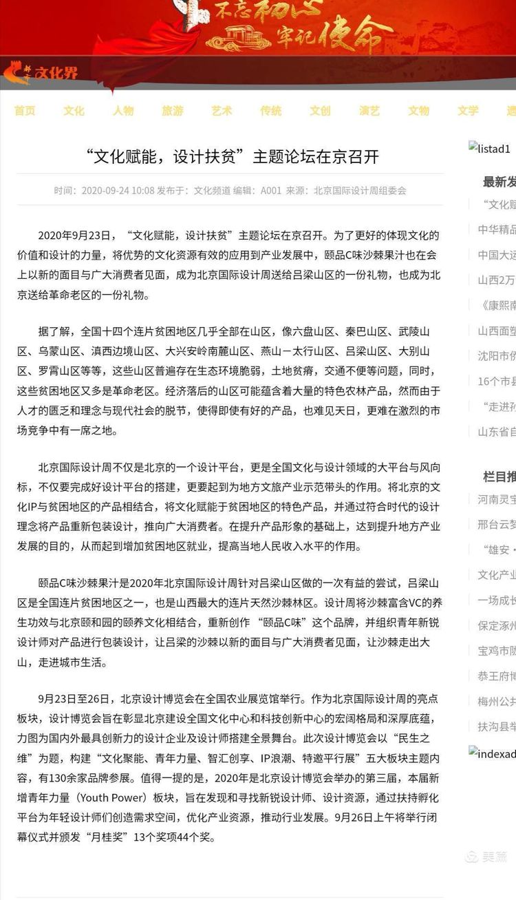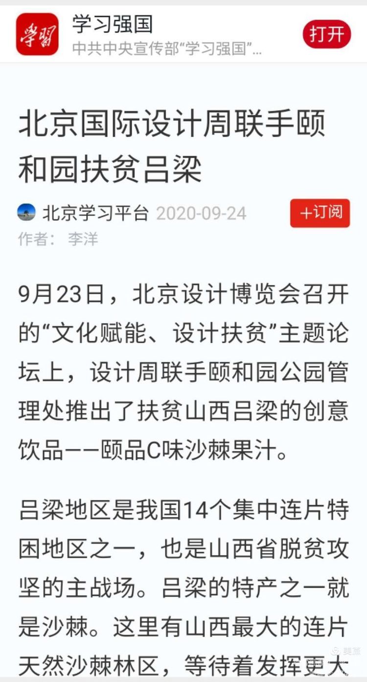 主題論壇上,北京國(guó)際設(shè)計(jì)周組委會(huì)辦公室副主任王昱東表示,北京國(guó)際設(shè)計(jì)周不僅是北京的一個(gè)設(shè)計(jì)平臺(tái),更是我國(guó)文化與設(shè)計(jì)領(lǐng)域的大平臺(tái)與風(fēng)向標(biāo),不僅要完成好設(shè)計(jì)平臺(tái)的搭建,更要起到為地方文旅產(chǎn)業(yè)示范帶頭的作用。將北京的文化IP與貧困地區(qū)的產(chǎn)品相結(jié)合,用文化創(chuàng)意賦能貧困地區(qū)的特色產(chǎn)品,并通過(guò)符合時(shí)代的設(shè)計(jì)理念將產(chǎn)品重新包裝設(shè)計(jì),推向廣大消費(fèi)者。“頤品C味-沙棘果汁產(chǎn)品”是北京國(guó)際設(shè)計(jì)周有限公司與北京市頤和園管理處聯(lián)手打造的一款產(chǎn)品,通過(guò)對(duì)沙棘飲料品牌的提升,帶動(dòng)當(dāng)?shù)厣臣a(chǎn)業(yè)發(fā)展,引導(dǎo)當(dāng)?shù)刎毨мr(nóng)戶采摘沙棘,提高經(jīng)濟(jì)收入,走出一條“文化賦能,設(shè)計(jì)扶貧”的新路線。同時(shí),王昱東還表示,這款產(chǎn)品就是“北京禮物”,是北京送給呂梁革命老區(qū)的一份禮物。